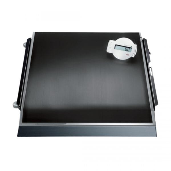 Báscula de plataforma electrónica lista para EMR. Esta báscula de plataforma, de gran tamaño y alimentada por pilas, posee una rampa integrada y es multifuncional. Permite pesar pacientes ambulatorios y, especialmente, pacientes con gran sobrepeso, pacientes en sillas de ruedas o bien con problemas circulatorios que necesiten sentarse