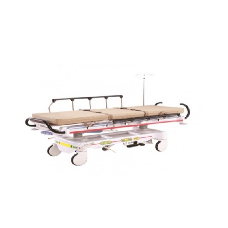 Camilla Hidráulica Neumática Básica radiotransparente, ideal para transporte de pacientes adultos. Sistema hidráulico de doble pedestal y pedales de ajuste de altura, localizados en ambos lados de la camilla. Altura ajustable de plataforma de 60.8 c
