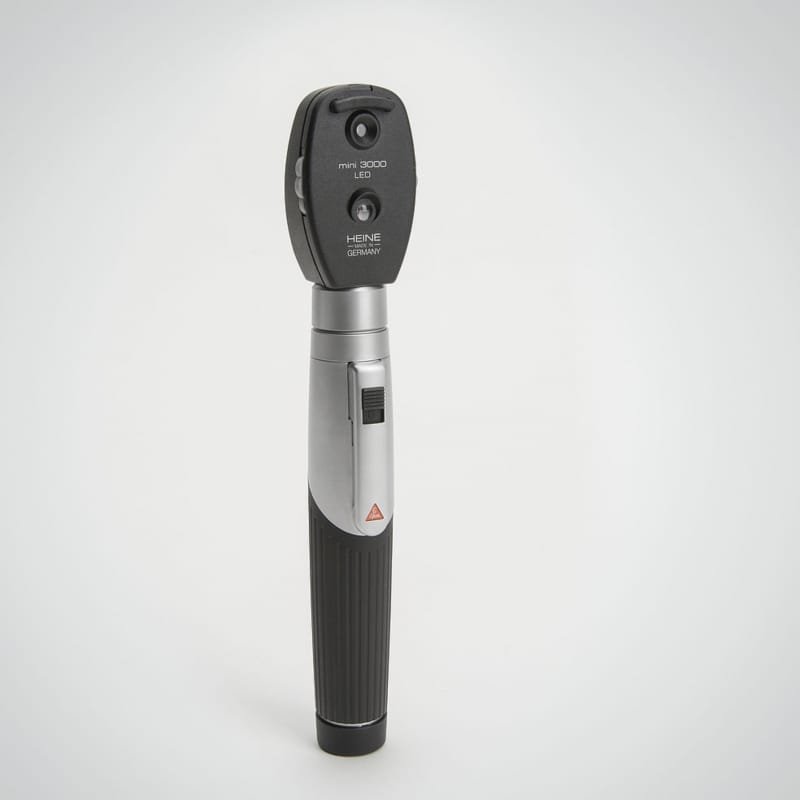 Oftalmoscopio moderno con luz LED que no necesita mantenimiento. Comparable en luz y reproducción cromática al oftalmoscopio HEINE con iluminación XHL Xenón halógena.